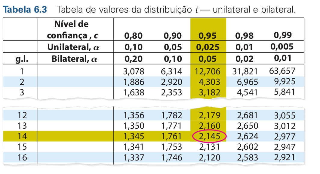 Para obtermos o valor de \(t_c\) consultamos a tabela de valores da distribuição \(t\). Podemos também obter os valores de \(t_c\) usando o R. Por exemplo, se quisermos saber o valor tabelado para um alfa de 0.05 com 14 graus de liberdade.