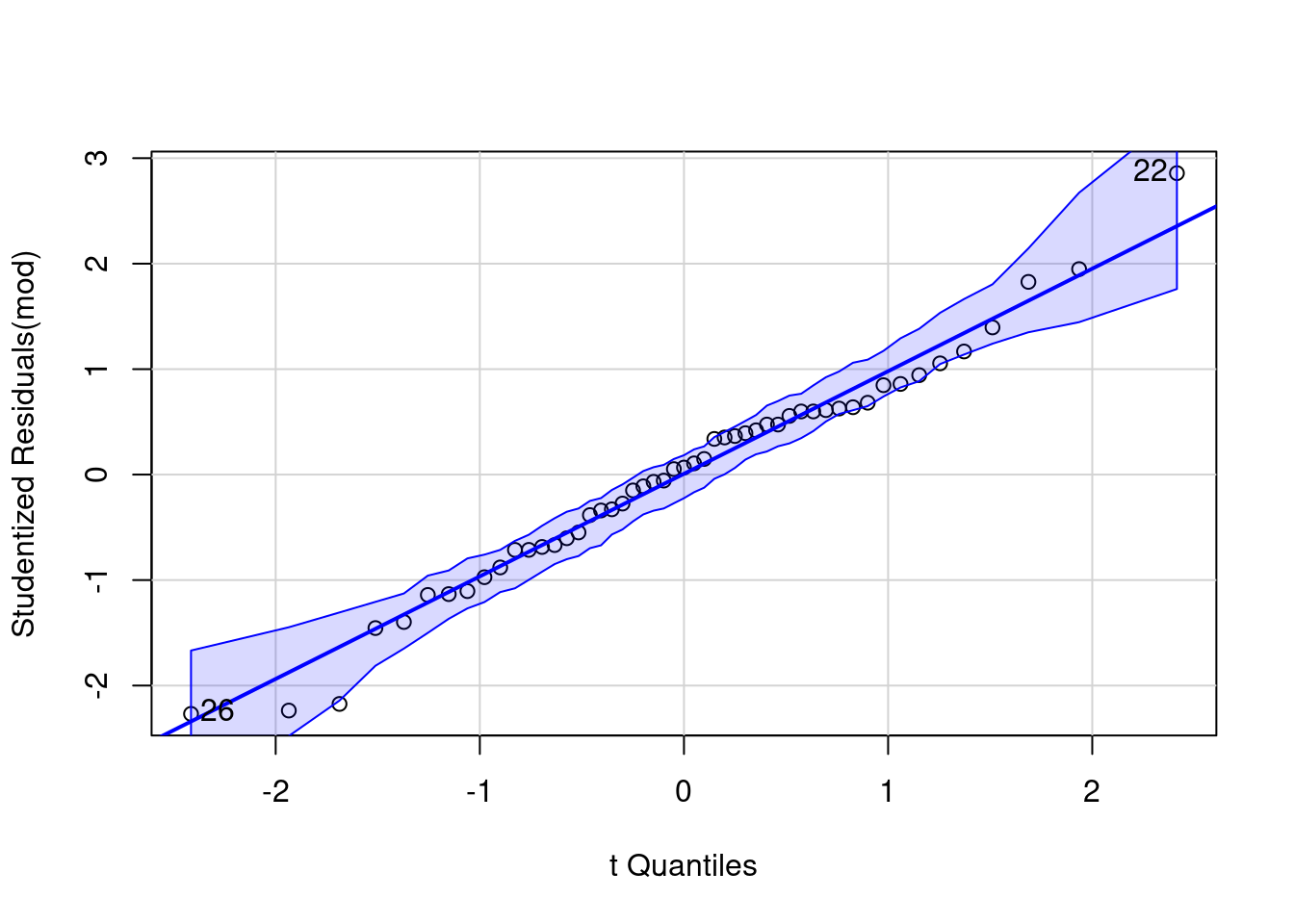 Para avaliar a normalidade dos resíduos podemos fazer visualmente através de um QQ-Plot.