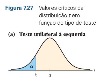Rejeitamos \(H_0\) se o valor de \(t\) calculado cair na cauda esquerda da curva (menor que \(t_0\)).