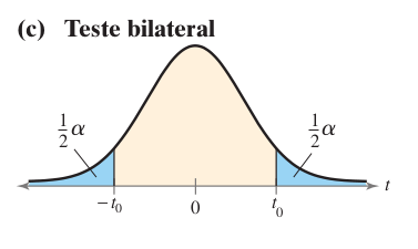 Rejeitamos \(H_0\) se o valor de \(t\) for muito pequeno ou muito grande (cair em qualquer uma das duas caudas).