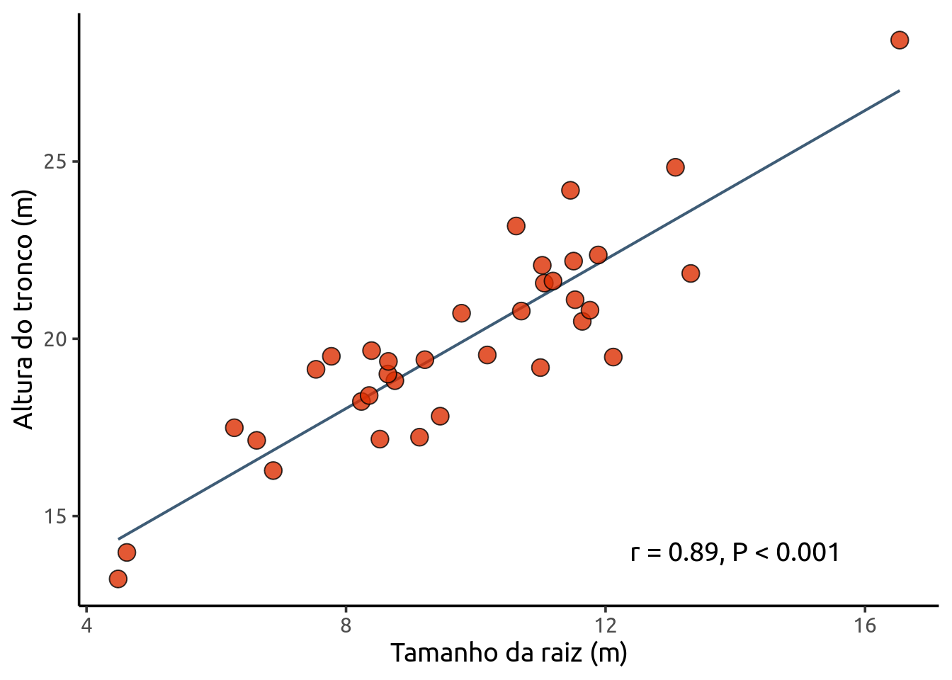 arbustos <- ecodados::correlacaoggplot(data = arbustos, aes(x = Tamanho_raiz,y = Tamanho_tronco)) +labs(x ="Tamanho da raiz (m)", y ="Altura do tronco (m)") +geom_smooth(method = lm, se =FALSE, color ="#3e5c76",linetype ="solid", linewidth=0.7) +geom_point(size =4, shape =21, fill ="#dc2f02", alpha =0.8) +annotate("text",x =14, y =14,label ="r = 0.89, P < 0.001",color ="black", size =5,family ="Ubuntu") +theme_classic(base_size =14, base_family ="Ubuntu") +theme(legend.position ="none")