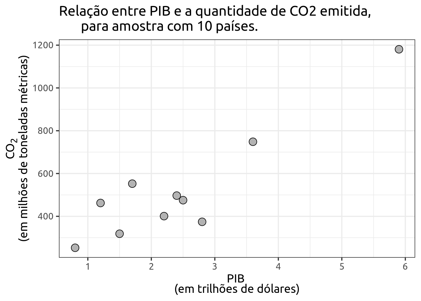 dados_pib_co2 <-tibble(PIB =c(1.7, 1.2, 2.5, 2.8, 3.6, 2.2, 0.8, 1.5, 2.4, 5.9),CO2 =c(552.6, 462.3, 475.4, 374.3, 748.5, 400.9, 253.0, 318.6, 496.8, 1180.6))library(ggtext)ggplot(dados_pib_co2,aes(x = PIB, y = CO2)) +geom_point(shape =21, size =4, fill ="grey70", color ="black")+theme_bw(base_size =14, base_family ="Ubuntu") +scale_x_continuous(breaks =1:6) +scale_y_continuous(breaks =seq(0,1200,by =200))+labs(title ="Relação entre PIB e a quantidade de CO2 emitida, para amostra com 10 países.",x ="PIB <br> (em trilhões de dólares)",y ="CO<sub>2</sub> <br> (em milhões de toneladas métricas)") +theme(axis.title =element_markdown())