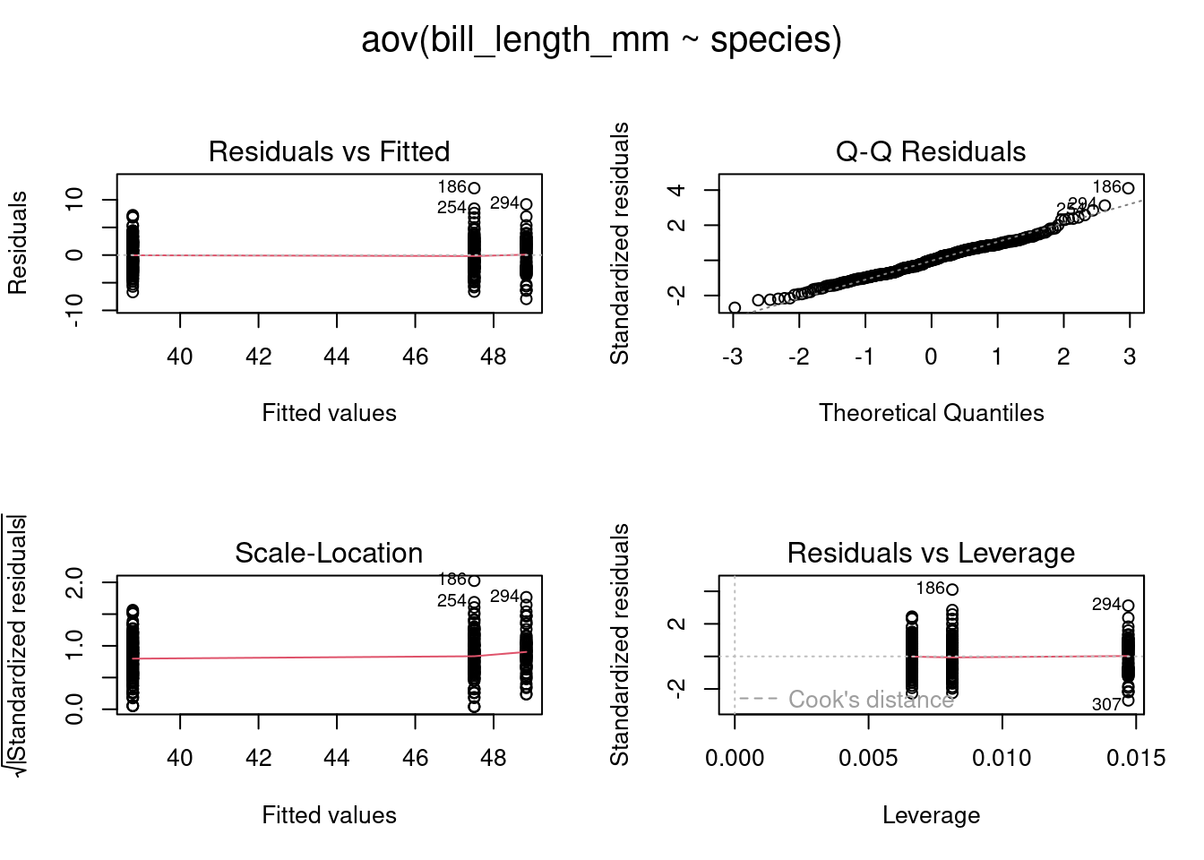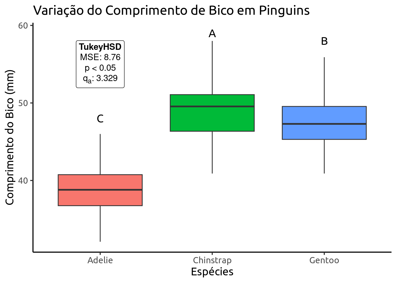 E aqui obtemos a nossa tabela da ANOVA. E com base no p-valor obtido podemos confirmar que existe efeito de Espécie sobre o Tamanho do Bico dos Pinguins. Em relação a nossa hipótese nula, isso significa dizer que pelo menos um dos grupos avaliados possui média diferente dos demais.